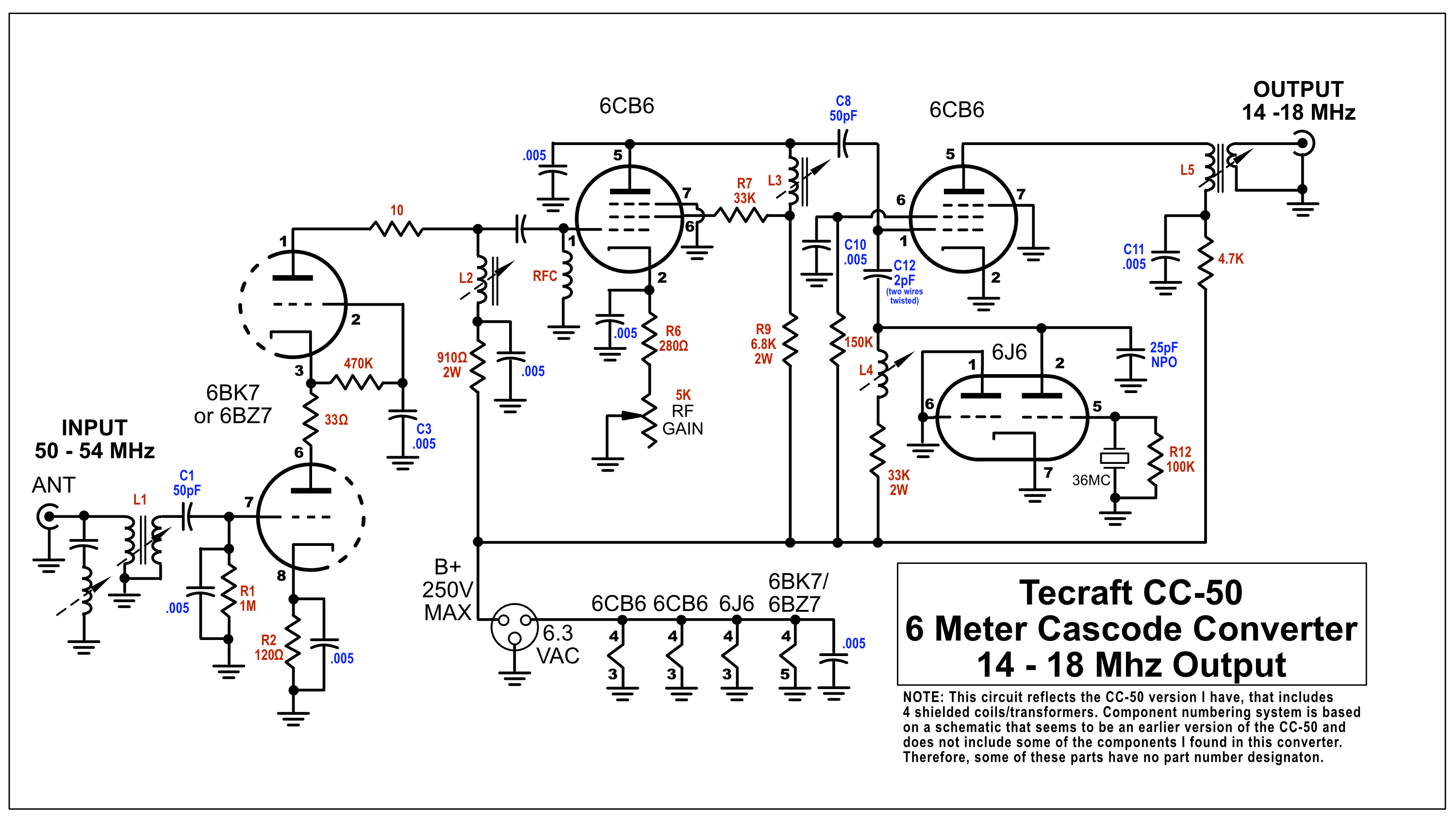 Tecraft produced VHF preamps, VHF converters and VHF transmitters in the 1950s and 60s. The company advertized in most of the better known amateur radio magazines, including QST, 73 and CQ. The converters were intended to be used with a communcations receiver that tuned, in this particular case, 14-18Mhz for the 50-54Mhz 6 meter band by using a 36Mhz crystal. Other receiver frequencies could be used with a change of crystal frequency on the converter. Tecraft later moved to using nuvisors instead of vacuum tubes in their converters and preamps